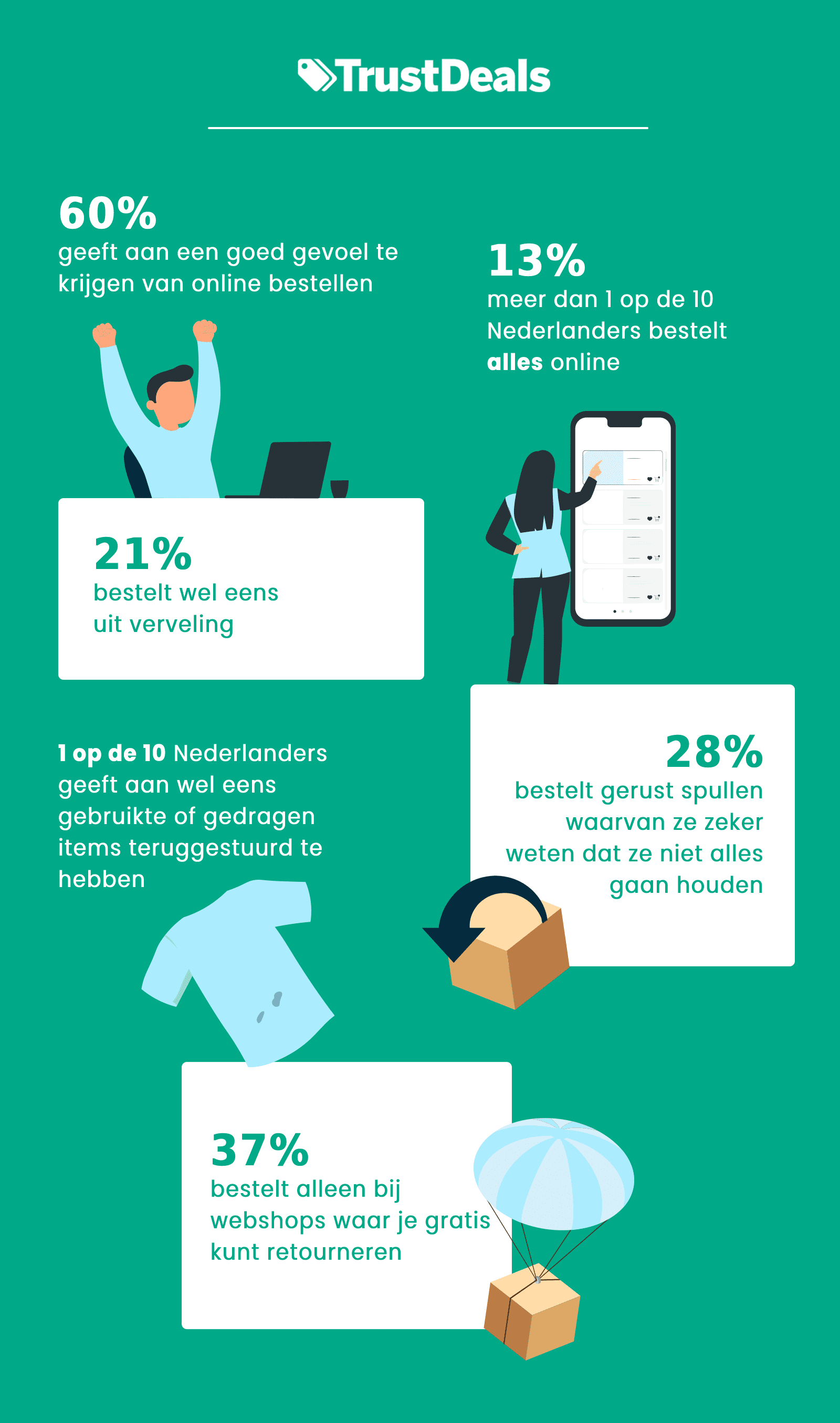 60% van de Nederlanders geeft aan een goed gevoel te krijgen van online bestellen. De grootste groep is tussen de 18 en 24 jaar. Dit komt naar voren uit onderzoek van TrustDeals. Bijna de helft van de Nederlanders (49%) geeft aan liever online te bestellen dan het artikel in een fysieke winkel te kopen.
