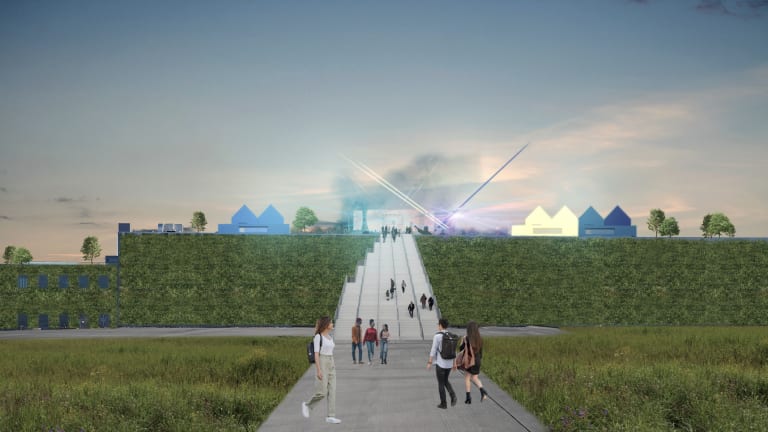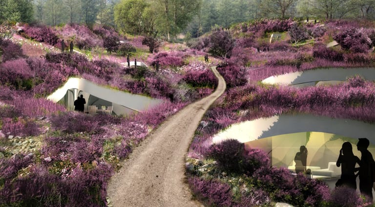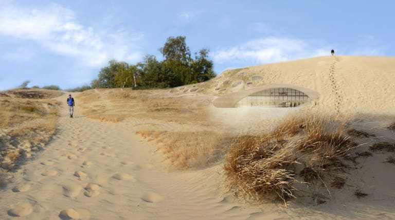 ‘Als je aan de klimaatopgave denkt, moet je groot durven denken,’ zegt Winy Maas. ‘Door zoveel mogelijkheden te onderzoeken, gaat het balletje rollen. Onze buitenexpositie bestaat straks uit tal van paviljoens die bijna als een kralensnoer in het landschap komen te liggen. We houden de bezoekers geen moralistische boodschap voor, maar laten ze klimaatverandering voelen; de droogte, de natheid. We tonen ook mogelijke oplossingen zoals een tuintoren of een superduin. Volgens mij ligt de opgave voor de komende tijd in de vervlechting van stad en natuur en van natuur en stad. We moeten hierbij open staan voor een kritische bejegening van elkaars idealen.’