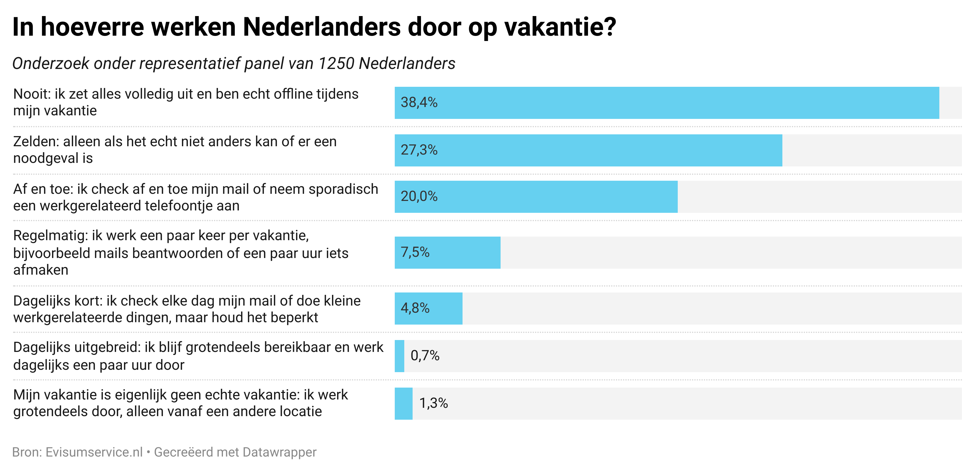 Een op de drie Nederlanders is tijdens vakanties nog altijd met het werk bezig. Een klein deel hiervan - een op de vijftien - checkt zelfs elke vakantiedag minimaal even werkgerelateerde mailtjes of telefoontjes. Dat blijkt uit een onderzoek van Evisumservice.nl onder een representatief panel van 1250 Nederlanders.