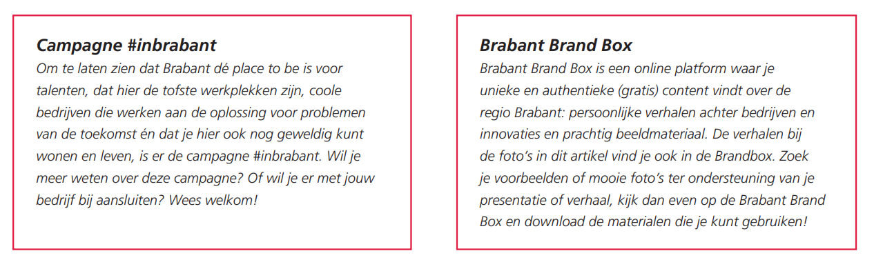 Team Brabant Branding is onderdeel van de Provincie Noord-Brabant. Het team werkt samen met vele partners aan een sterk imago van de regio Brabant en biedt diverse instrumenten om te inspireren, mooie voorbeelden te delen en de Brabantse trots uit te dragen.Meer informatie, contactgegevens, alle genoemde onderzoeken, artikelen bij de foto’s en links naar campagne en Brabant Brand Box vind je in één oogopslag op www.brabantbranding.nl/inbusiness