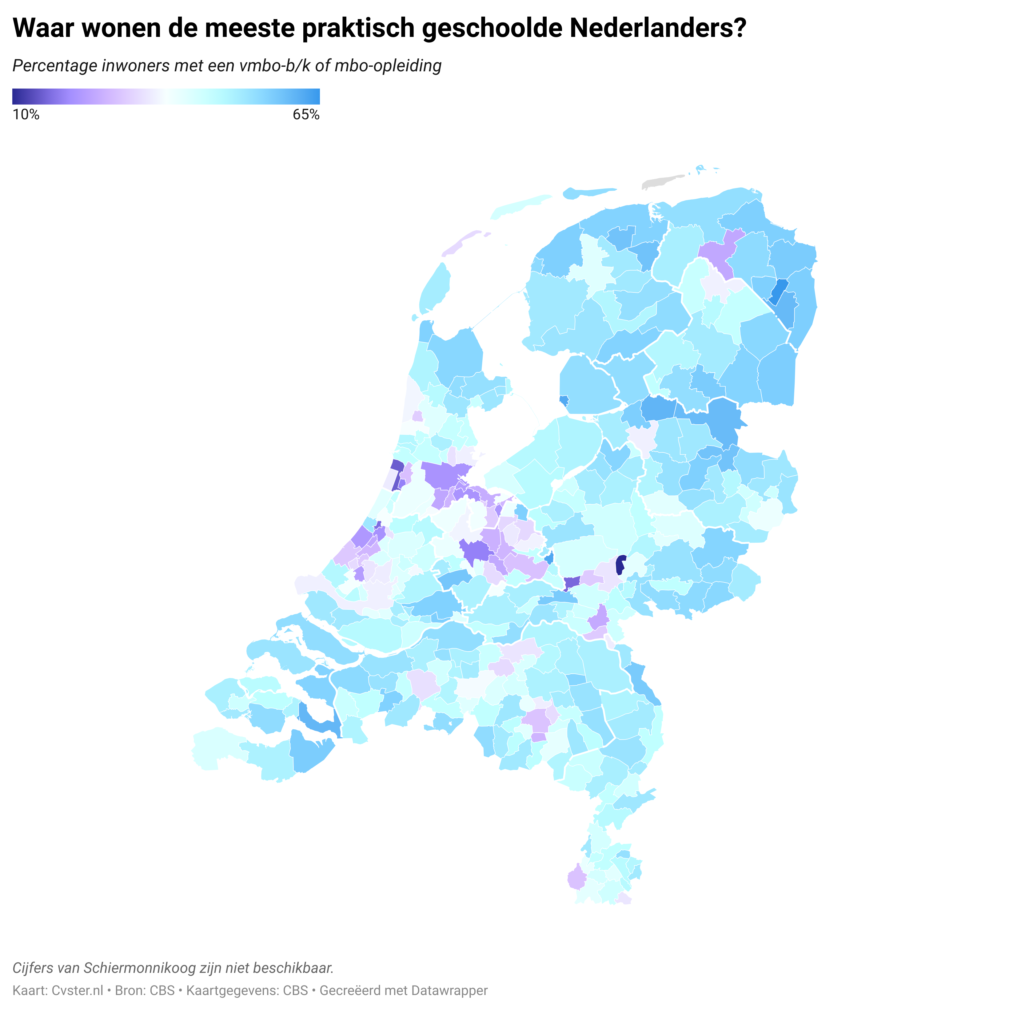 Een kleine 42 procent van de Nederlanders heeft een mbo-diploma op zak. In Drenthe, Friesland en Zeeland geldt dat voor ruim 51 procent, terwijl Utrecht slechts 34 procent scoort. In de Groningse gemeente Pekela zijn zelfs twee op de drie inwoners praktisch opgeleid, net iets meer nog dan in Renswoude en op Urk. Er zijn daarentegen 55 gemeenten waar meer theoretisch geschoolden (hbo of wo) wonen dan praktijkmensen. In Bloemendaal is dit verschil het grootst.