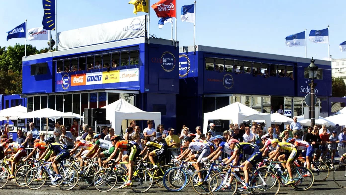 De Movico hospitality units in de beginjaren van de samenwerking met de Tour de France op de Champs-Elysées in Parijs