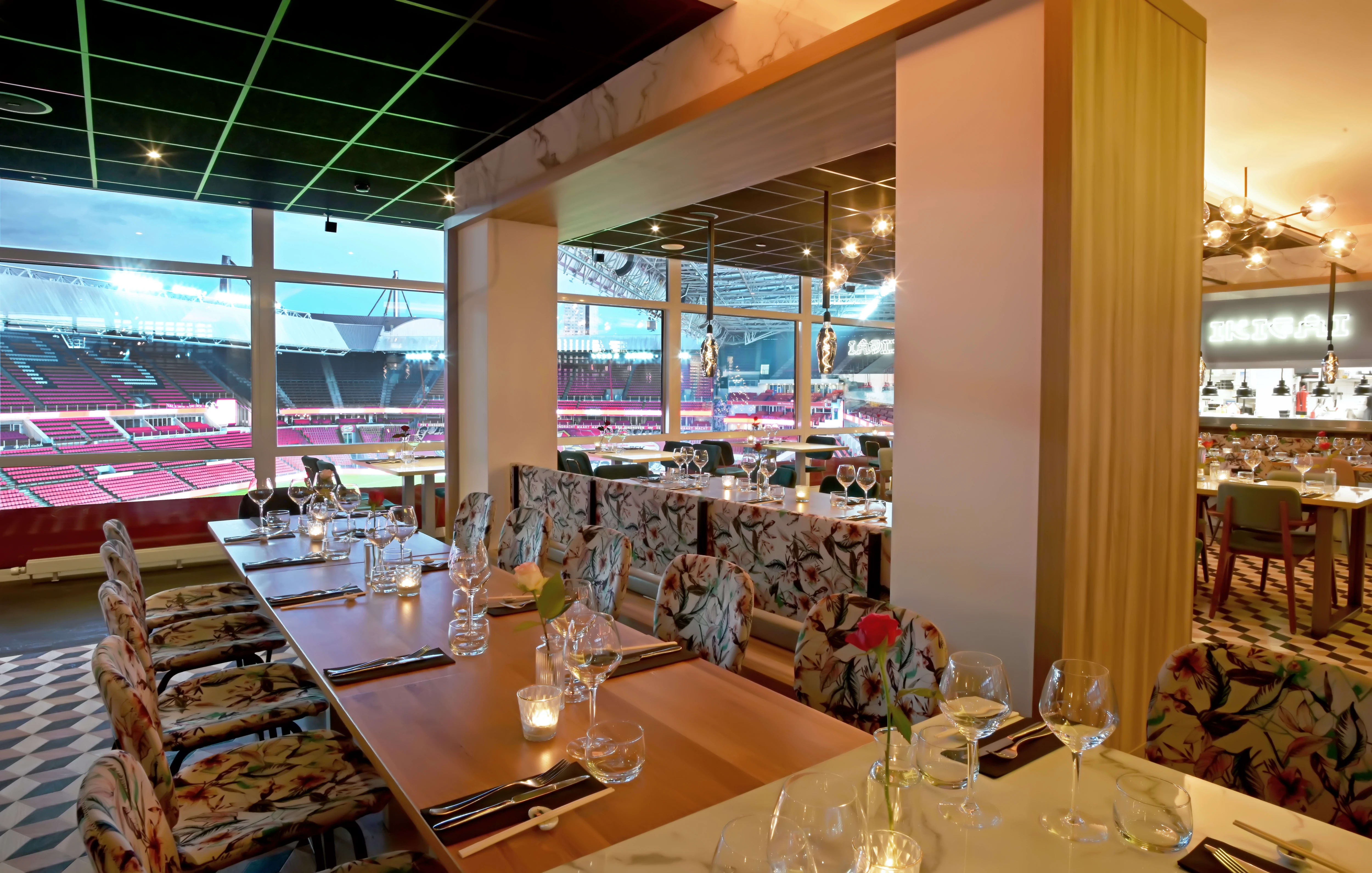 Bij binnenkomst is het eerste wat we doen naar de grote raampartij lopen. Het uitzicht op het veld van het Philips Stadion is en blijft indrukwekkend. Zelfs als het stadion leeg is. We kunnen ons er alles bij voorstellen hoe een bezoek aan Aziatisch fusionrestaurant Ikigai is op een wedstrijddag van PSV of bijvoorbeeld de zachte G-concerten van Guus Meeuwis. Ja, dit is mooi. Als we ons omdraaien, kijken we in de lachende gezichten van gastheer Simon de Wit en zijn vrouw Angelique. “Welkom bij Ikigai, zeg nou zelf ‘Eindhovenser’ dan dit ga je het toch niet krijgen?”