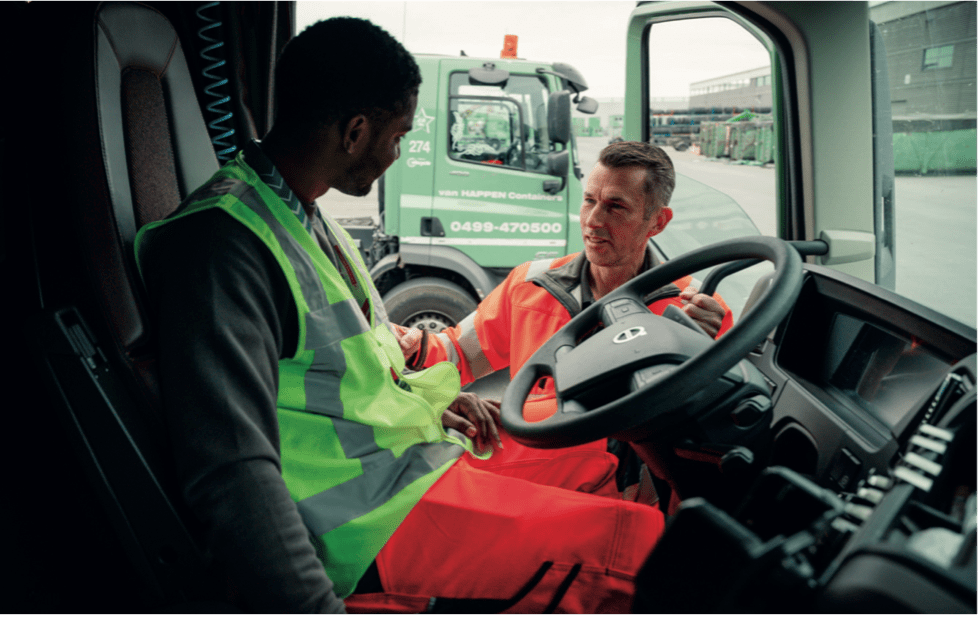 “Na zes weken gaat de chauffeur op pad, dagelijks begeleid door een mentor die hem intensief coacht vanaf het moment van aanmelden ’s ochtends tot einde werkdag. Een aankomende chauffeur heeft individuele aandacht nodig en moet vertrouwen opbouwen. De mentor begeleidt hem bij het navigeren, het manoeuvreren op locatie, het bedienen van de boordcomputer, het optreden bij klanten. Hij koppelt terug, evalueert en maakt een inschatting wanneer de kandidaat zelfstandig op pad kan. Dat vraagt behalve technische skills ook inzicht in mensen. Van Happen Containers is natuurlijk bovenal een familiebedrijf, dus proberen we nieuwe medewerkers vooral ook gevoelsmatig onderdeel te maken van de organisatie. Een organisatie die voelt als een warm bad.”